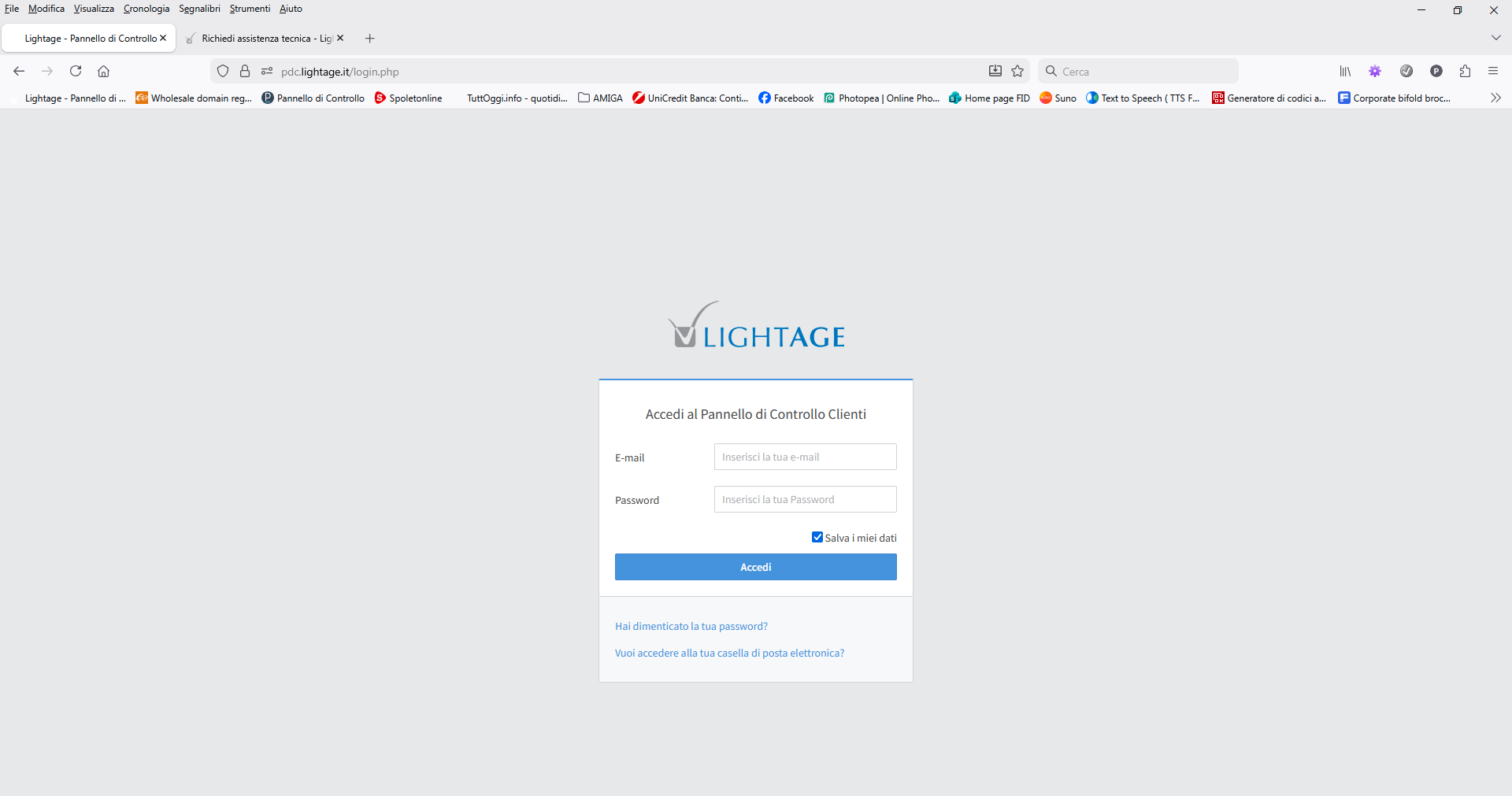 Collegati su https://pdc.lightage.it e inserisci la tua e-mail e la password di accesso al Pannello di Controllo Clienti.
