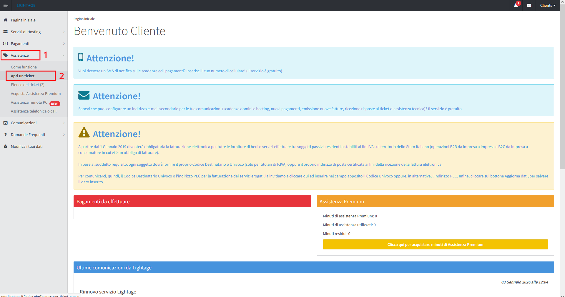 Una volta effettuato l’accesso, clicca nel menu laterale su “Assistenze” e poi su “Apri un ticket”.